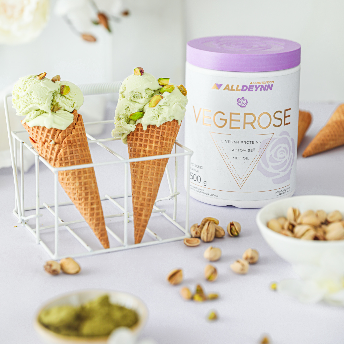 ALLDEYNN VEGEROSE je vysokoproteínový doplnok stravy na báze premixu päť rastlinných bielkovín: hrachový proteínový izolát, ryžový proteínový koncentrát, brusnicový proteínový koncentrát, mandľový proteínový koncentrát a konopný proteín. Je obohatený o značkový probioticko-prebiotický komplex LactoWise®, akáciovú vlákninu, ľanové semienka a MCT olej.