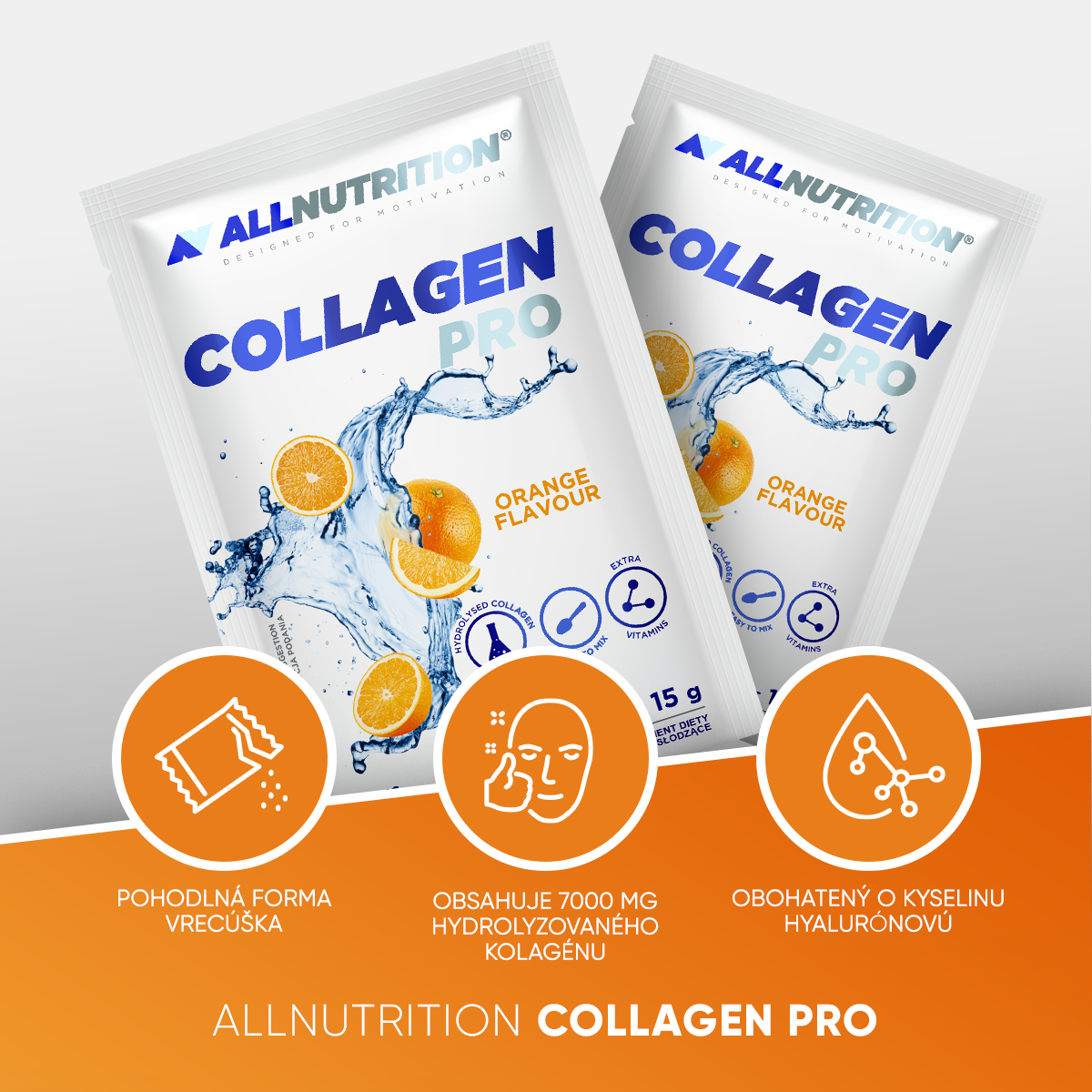 ALLNUTRITION COLLAGEN PRO je doplnok stravy, ktorý poskytuje až 7 000 mg hydrolyzovaného kolagénu vo forme pohodlných vrecúšok - rozpustí sa a vypije. Obsahuje mnoho cenných a potrebných látok. Obsahuje mnoho cenných a potrebných látok. Vďaka obsahu vitamínov a minerálov podporuje zdravie a pohybový aparát.