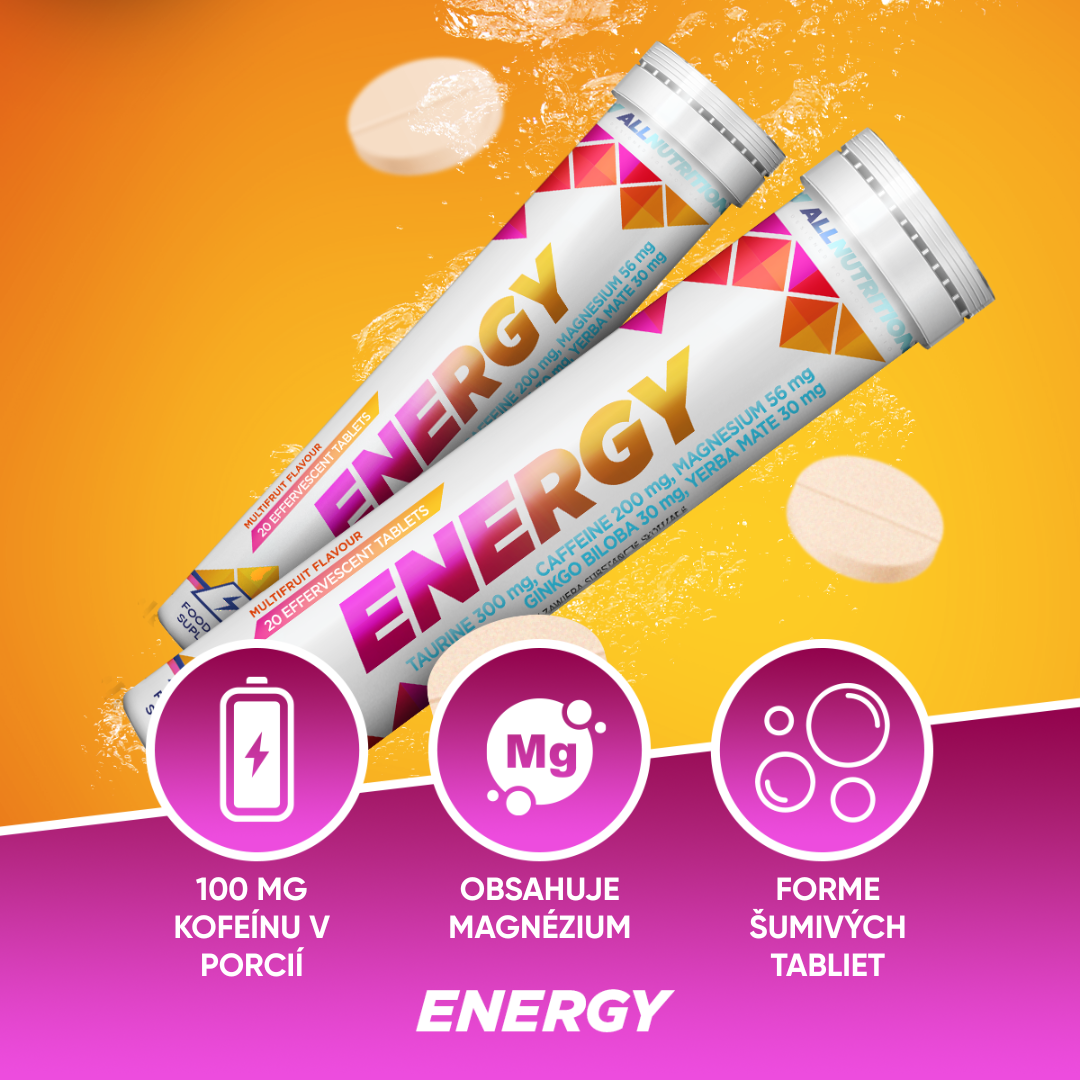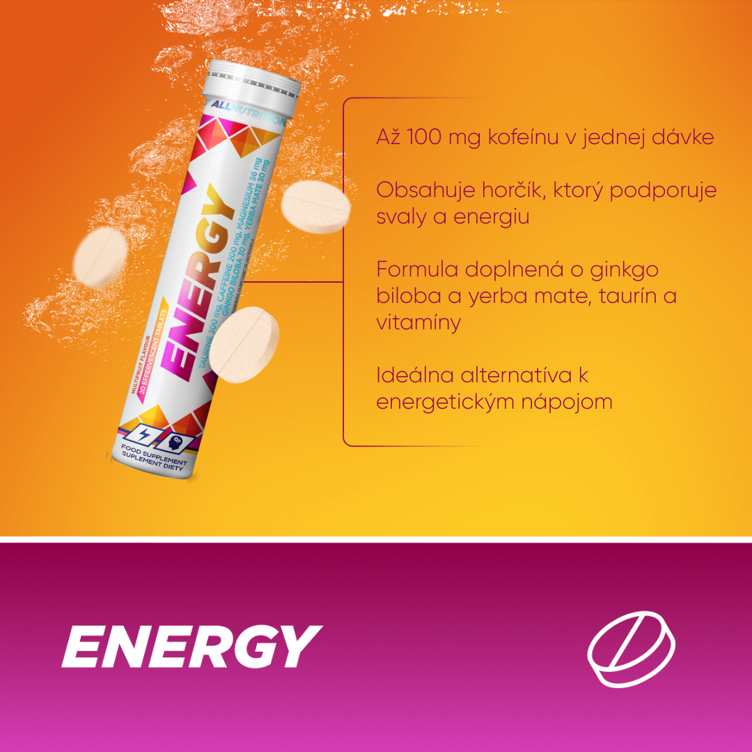 ALLNUTRITION ENERGY je komplexný prípravok vo forme šumivých tabliet s lahodnou ovocnou príchuťou. Obsahuje synergickú kombináciu taurínu, kofeínu, horčíka a vitamínu B12. Formula bola navyše obohatená o extrakt z yerba mate a ginkgo biloba. Produkt je určený pre ľudí, ktorí potrebujú rýchlu podporu v období zvýšenej duševnej a fyzickej námahy.