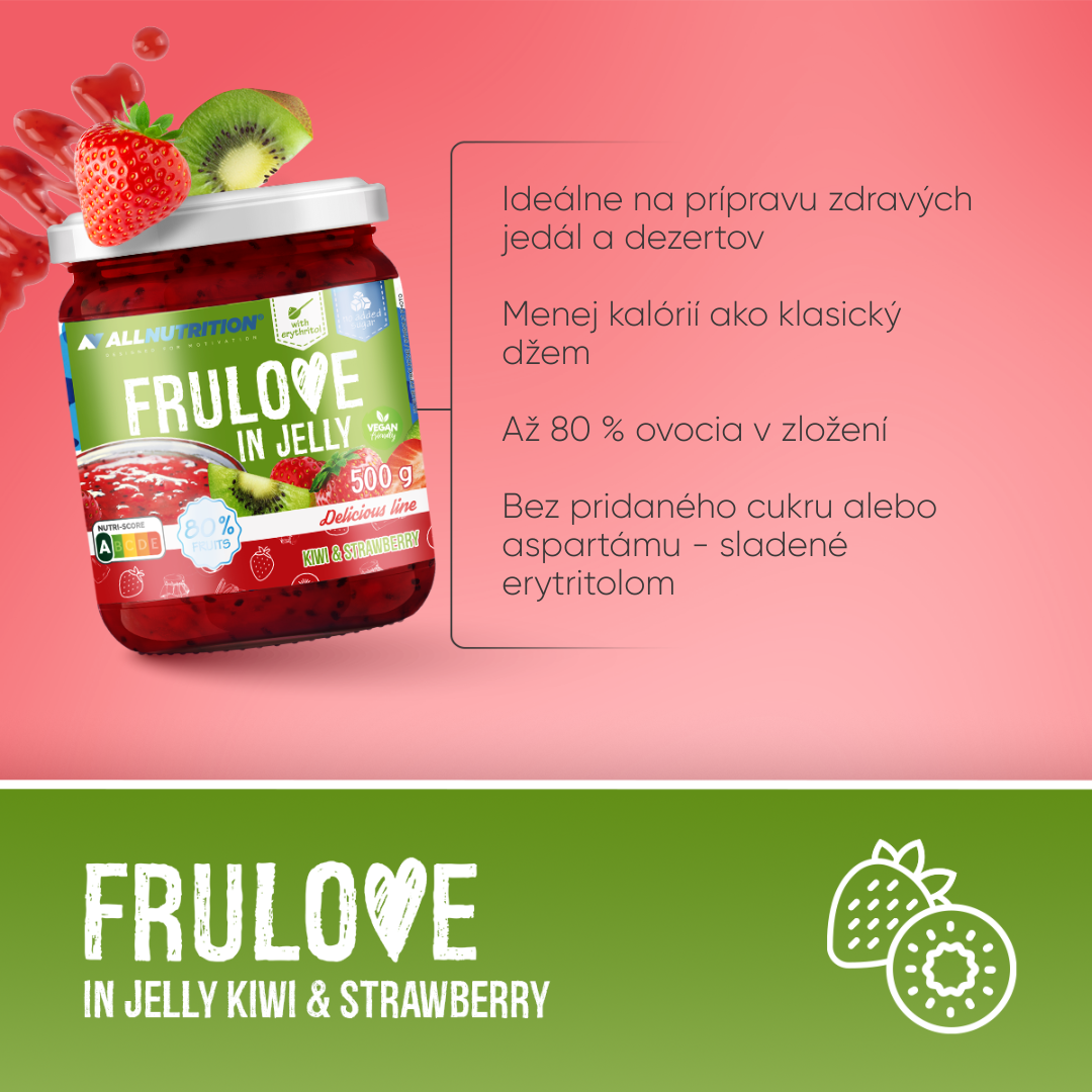 kiwi (40%), jahody (40%), voda, sladidlo: erytritol, modifikovaný škrob., aróma, stabilizátor: chlorid vápenatý, regulátor kyslosti: kyselina citrónová, konzervačná látka: sorban draselný, sladidlo: sukralóza.