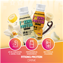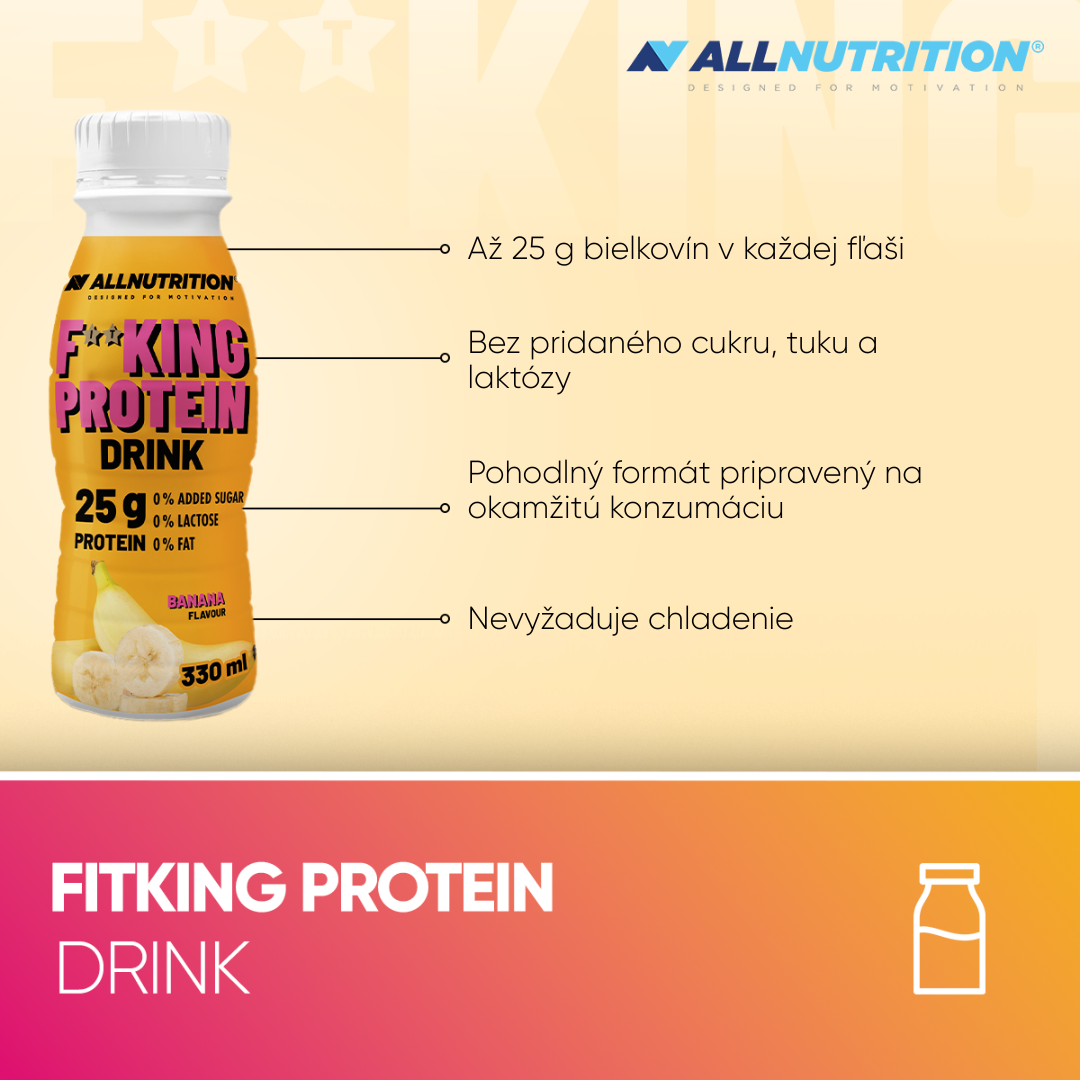 ALLNUTRITION FITKING PROTEIN DRINK je chutný, vysokoproteínový mliečny nápoj dostupný v dvoch výnimočných príchutiach – vanilkovej a banánovej. Každá fľaša poskytuje až 25 g bielkovín a zároveň neobsahuje pridaný cukor, laktózu ani tuk. Je to pohodlné riešenie pre každého, kto chce doplniť svoju stravu o kvalitné živiny – bez ohľadu na denný režim. Skvele sa hodí do práce, na cesty, po tréningu alebo jednoducho vtedy, keď potrebuješ niečo rýchle a výživné.