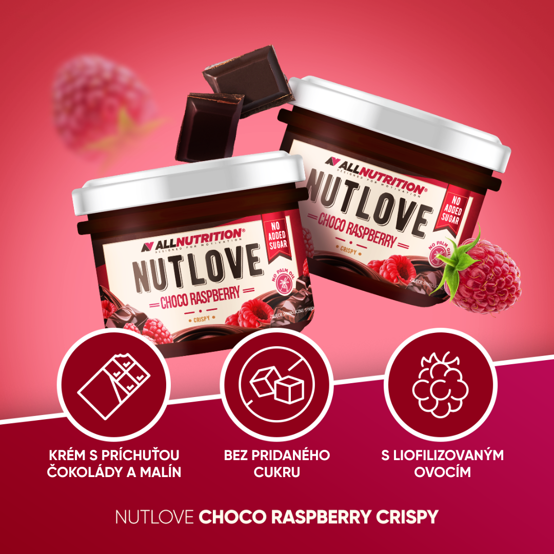 ALLNUTRITION NUTLOVE CHOCO RASPBERRY je lahodný čokoládovo-malinový krém s kúskami chrumkavých, lyofilizovaných malín. Je to nová, očarujúca verzia bestsellerovej série krémov NUTLOVE, ktorá si získala srdcia tisícov zákazníkov. Ideálny pre každého, kto hľadá zdravšiu alternatívu ku klasickým sladkostiam, bez kompromisov v chuti. Krém neobsahuje pridaný cukor ani palmový olej, vďaka čomu je skvelým doplnkom k vašim obľúbeným fit dezertom.
