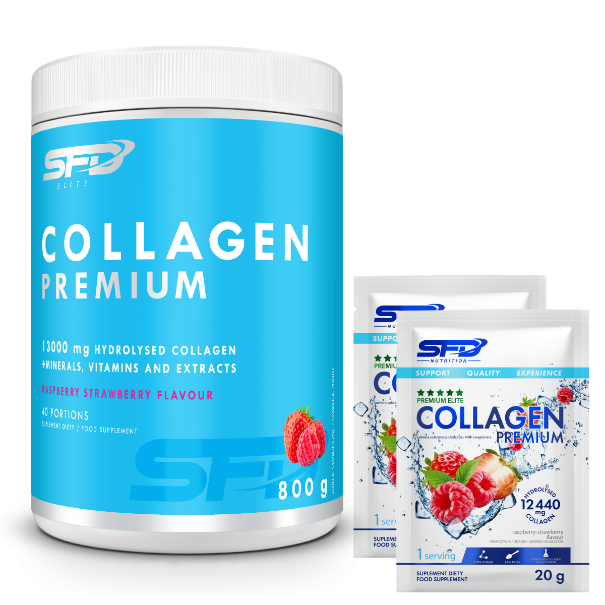 SFD COLLAGEN PREMIUM je kolagén na pitie, ktorý dodáva až 13 000 mg hydrolyzovaného kolagénu v jednej porcii. Vďaka starostlivo vybraným zložkám ponúka produkt vynikajúci pomer kvality a ceny a podporuje pokožku, kĺby, kosti a zuby.