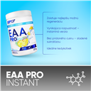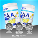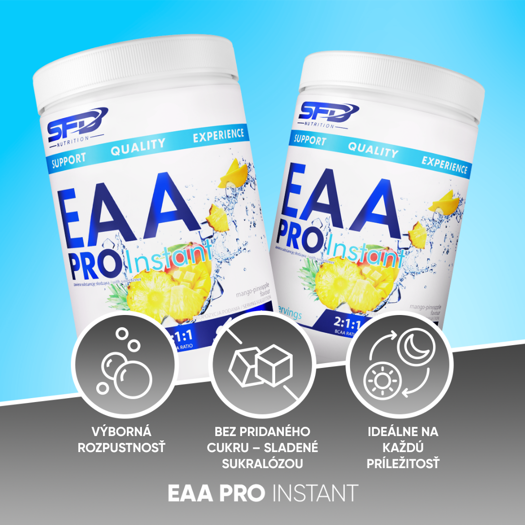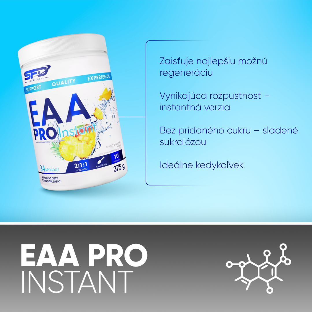 SFD EAA PRO INSTANT doplnok stravy obsahujúci všetky esenciálne aminokyseliny (EAA), ktoré organizmus nedokáže sám syntetizovať a musí ich prijímať z vonkajších zdrojov. Zloženie: histidín, izoleucín, leucín, valín, lizín, metionín, fenylalanín, treonín, tryptofán a navyše aj arginín.